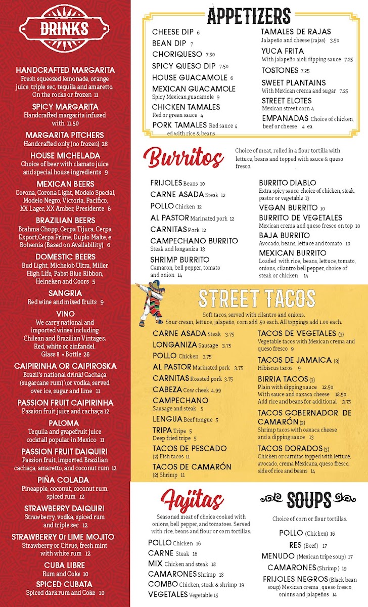 From a reviewer’s perspective, the menu at Via Brazil Cafe & Market offers a comforting selection of Brazilian favorites at approachable prices, with highlights across sandwiches, main dishes, starters, and finger foods. The sandwich section features hearty options like the Choripan Sandwich, Peito De Frango Milanesa, Bife Com Cebola, Misto Completo, and Misto Quente, each offering a satisfying and casual meal choice. For more filling plates, the main dishes such as Prato Brasileiro, Peixe Frito Recheado De Camarão, Peixe Frito, and Prato Frango Filé provide traditional flavors and generous portions. The starters are also worth noting, including Linguiça Com Cebola, Plátano Verde (Tostones), Mandioca Frita, Plátano Doce, and Queijo Coalho (2 Pieces), which are perfect for sharing or beginning the meal. The finger food selection adds even more variety with popular snacks like Bolinha De Queijo (6), Kibe, Pão De Queijo (6), Pastel De Feira, and Empanadas De Carne, Queijo Ou Frango, making the menu well-rounded and appealing for both quick bites and full meals. Overall, the menu balances traditional Brazilian comfort food with casual café favorites, giving diners a flavorful and affordable dining experience.